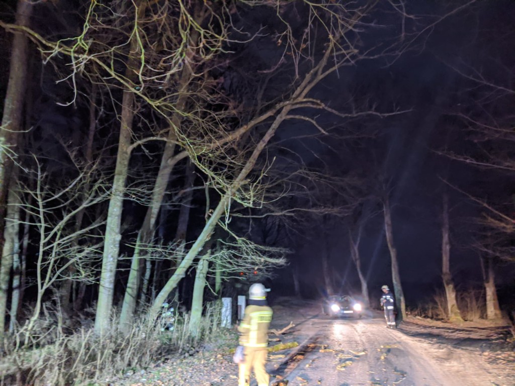 W godzinach nocnych tego dnia do zdarzenia zadysponowany został również nasz zastęp. Na trasie Skoki-Węgorzewo wskutek silnych podmuchów wiatrów doszło do złamania drzewa, które spadając zatrzymało się na innych gałęziach i zwisało niebezpiecznie nad jezdnią. Działania strażaków polegały na całkowitym przewróceniu drzewa i udrożnieniu przejazdu na drodze powiatowej.