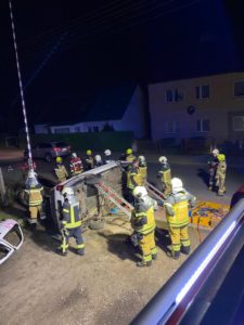 Nim jednak do nich doszło trzeba było przygotować odpowiednią bazę do ćwiczeń. Część naszych uczestników przygotowało drewno na ognisko w lesie, przywiezione zostały samochody do ćwiczeń oraz zakupiono niezbędne wyposażenie i materiały do ćwiczeń. Ćwiczenia rozpoczęły się w piątek po śniadaniu. Uczestnicy w mieszanych grupach działali na różnych stanowiskach. Jedni ćwiczyli węzły, inni cięli elementy betonowe i stalowe za pomocą przecinarki, a jeszcze inni zajmowali się cieciem pojazdów. Wydobywanie i opatrywanie rannych też było w naszym scenariuszu. Ćwiczenia w ciągu dnia zgromadziły także sporą grupę obserwatorów. Podobnie było w nocy ale działania były ciekawsze i bardziej widowiskowe. Był też czas na relaks- podczas wspólnych działań nad rzeką i przy ognisku. Kolejne spotkanie i już ostatnie w ramach tego projektu odbędzie się w październiku w Niemczech.