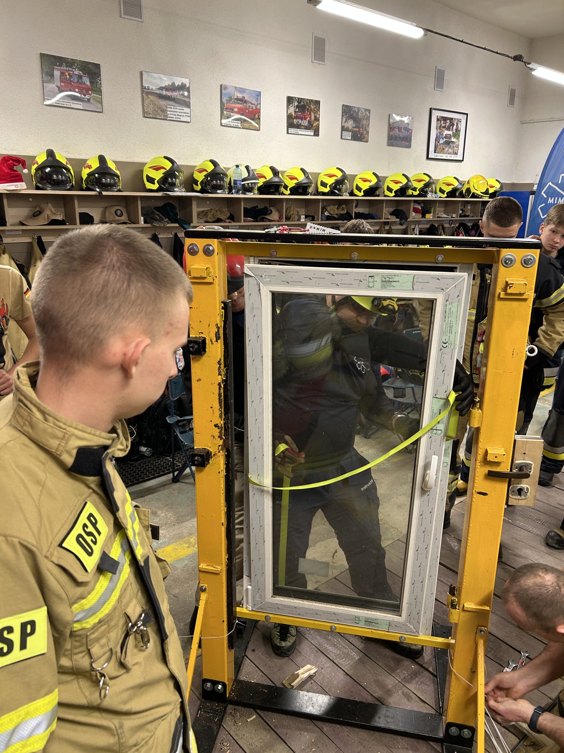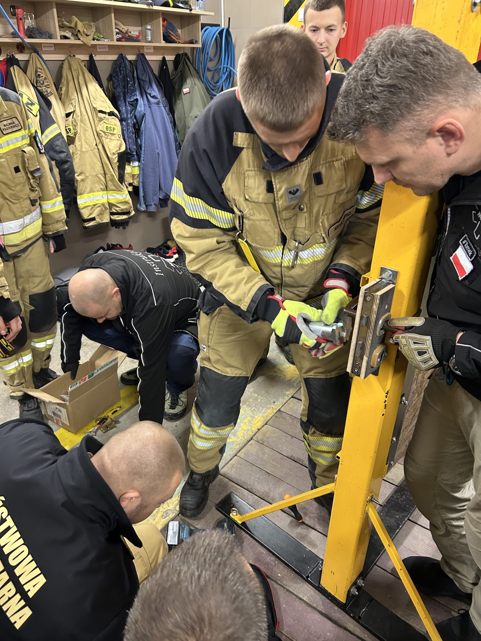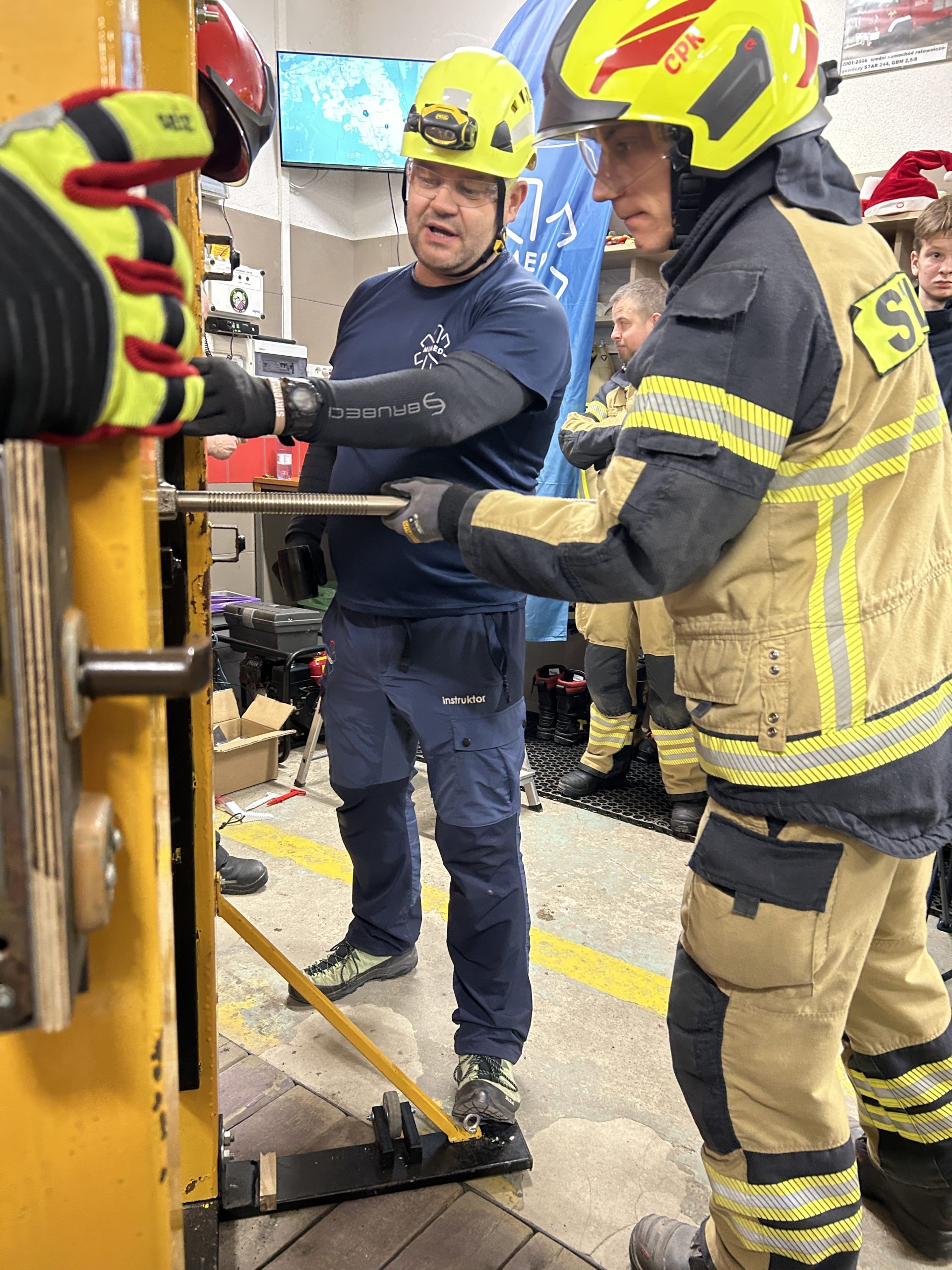 Na ostatniej tegorocznej zbiórce gościliśmy firmę MIMED z Koszalina, której instruktorzy zorganizowali dla Nas ćwiczenia z siłowego pokonywanie przeszkód takich jak drzwi, okna, zamki. Na szkolenie gościnnie przybył również zastęp z JRG Szczecinek, którego strażacy również wzięli udział w zajęciach. Ćwiczenia z siłowego otwierania drzwi to specjalistyczne szkolenia dla służb ratowniczych (strażaków, policjantów) obejmujące techniki wyważania, łamania zamków, cięcia kłódek i zawiasów, często z użyciem specjalistycznych narzędzi (hooligan, łamak, wyważarka, zestawów rapid enter). Strażacy uczyli się jak otwierać drzwi i okna w różnych sytuacjach (np. z kilkoma zamkami, w narożnikach), minimalizując zniszczenia i współpracując w zespole, a praktyka odbywa się na specjalnych treżerach.