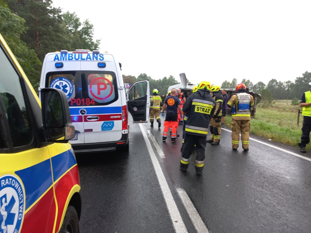 W wyniku zderzenia pojazd dostawczy przewrócił się na bok blokując jeden pas ruchu, natomiast auto ciężarowe pozostało na jezdni. W zdarzeni łącznie brały udział trzy osoby, które opuściły pojazdy przed przybyciem służb ratunkowych. Działania polegały na zabezpieczeniu miejsca zdarzenia i pojazdów. Osoby biorące udział w zdarzeniu po przebadaniu przez ZRM zostały na miejscu.