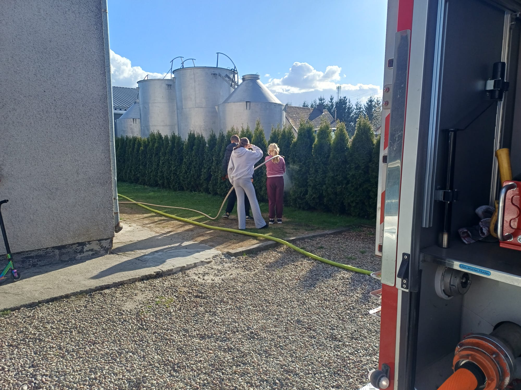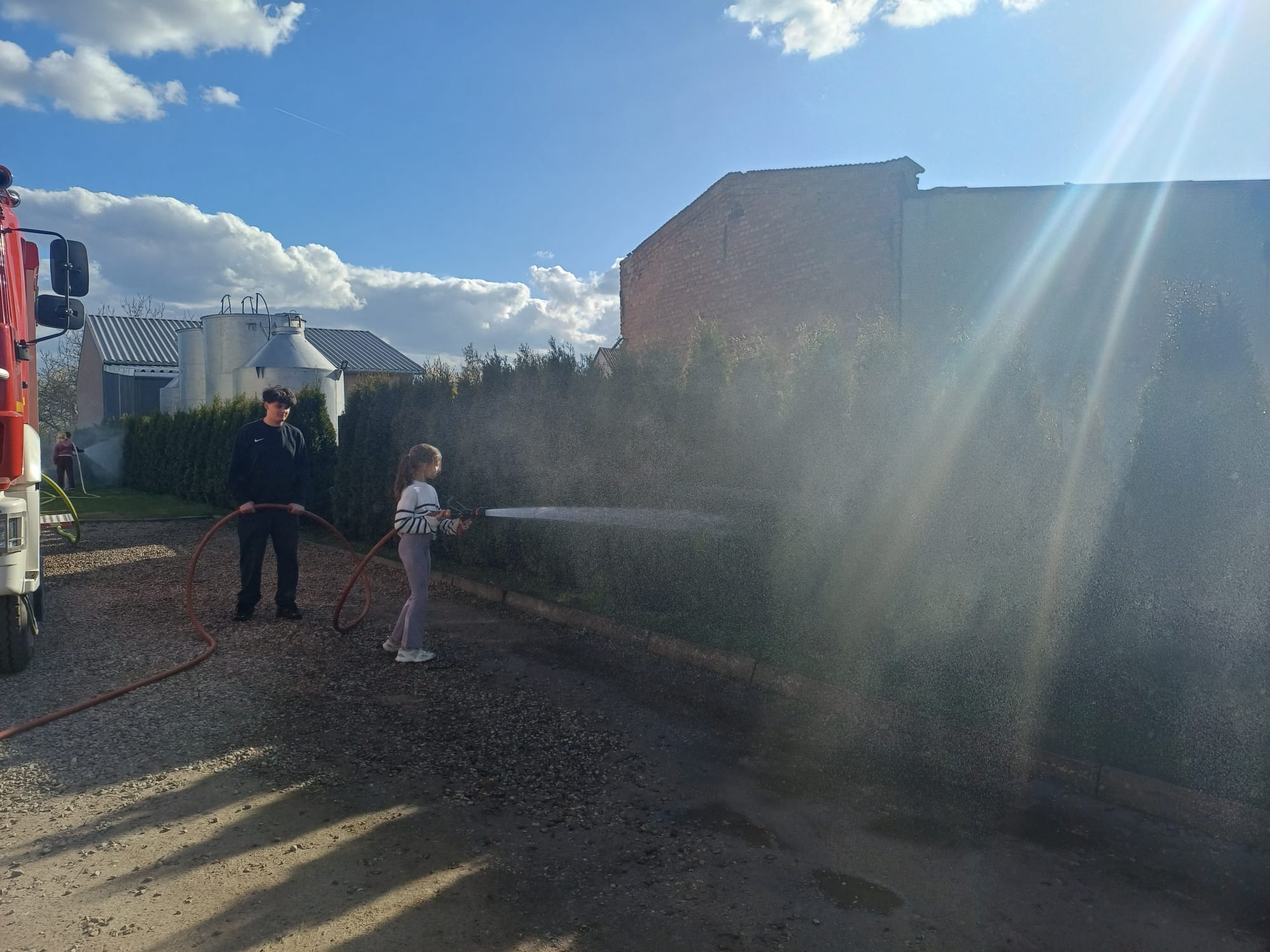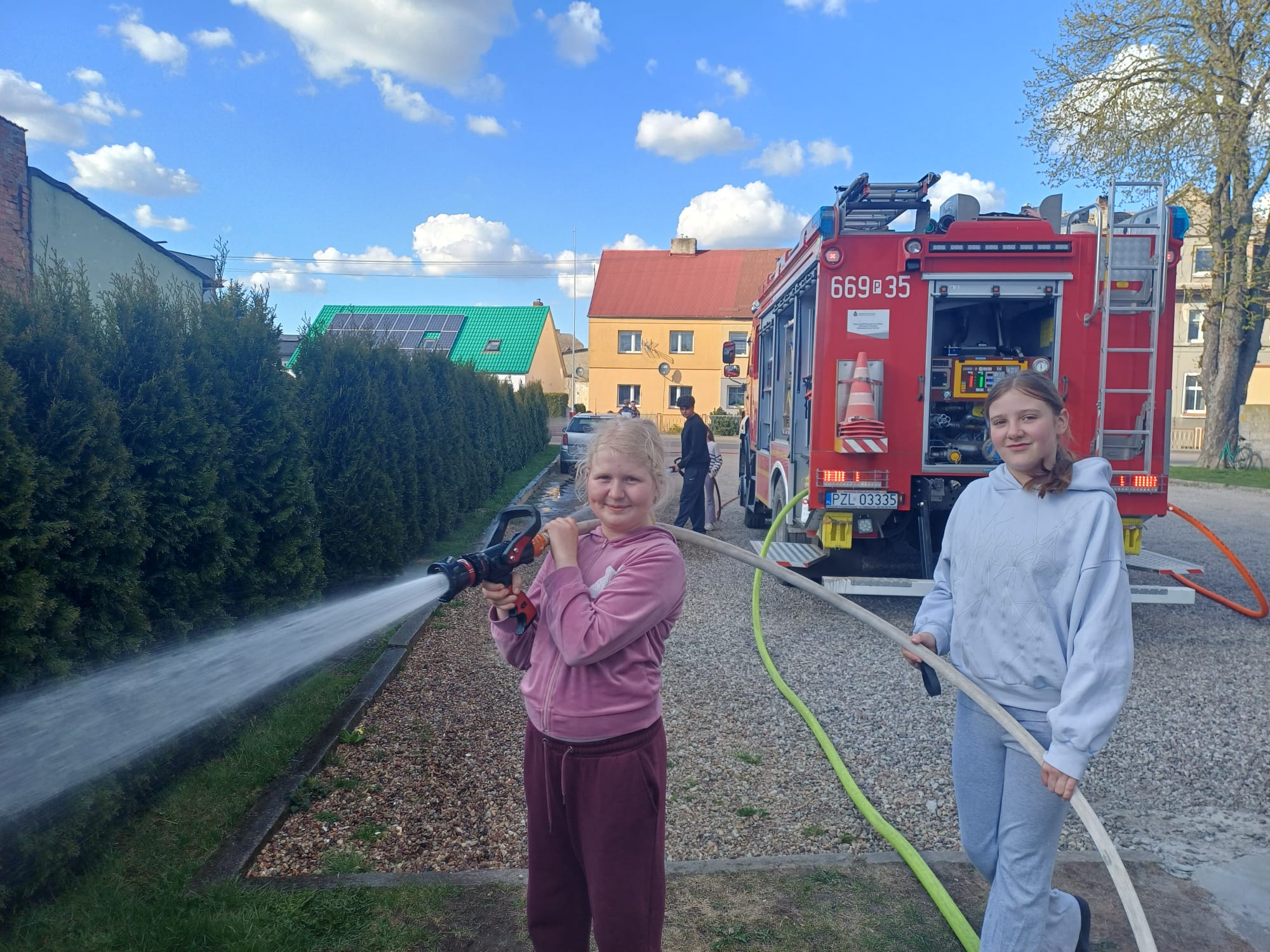 25 kwietnia 2026Pogoda sprzyja zajęciom i zabawie na zewnątrz więc i 24 kwietnia MDP skorzystała z aury pogodowej i przeprowadziła swoje zajęcia na słoneczku. Tego dnia młodzież przećwiczyła aspekty budowania linii gaśniczych z pojazdu. Doskonalono techniki zwijania i rozwijania odcinków węży, łączenia ich oraz operowania prądem wody.